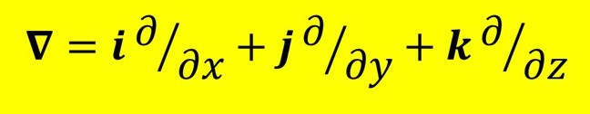 The operator ∇ is defined by the equation at the beginning of this post (highlighted in yellow). Here i, j and k are the orthogonal unit vectors defining an orthogonal Cartesian coordinate system (post 17.3) and x, y and z are the components of a vector in each of these directions, respectively; ∂/∂x, ∂/∂y and ∂/∂z represent partial derivatives (post 19.11) with respect to x, y and z, respectively. ∇ is written in bold because it’s a vector operator. The symbol ∇ is called del or nabla – “nabla” is supposed to be an ancient Greek word for a harp; I don’t know the origin of the word “del”.