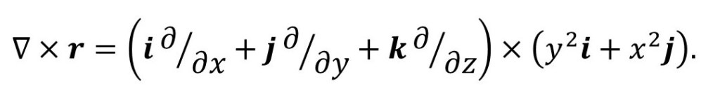 Note that the vector r, in this example, lies in the plane defined by the vectors i and j so ∇ × r is a vector perpendicular to r. The result is sometimes called the curl of r (for reasons that need not concern us when we meet the Navier-Stokes equation) and is written