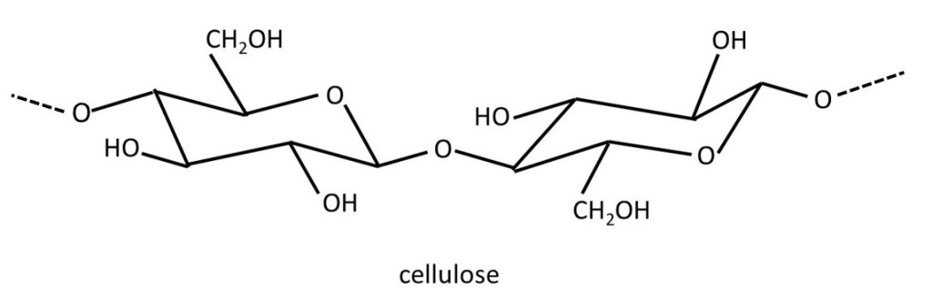 Cells (post 16.18) in plants are surrounded by a rigid wall made of the polysaccharide (post 20.38) cellulose that consists of repeating β-D-glucose residues (post 20.38) as shown above. In this picture, the second residue is identical to the first but I have shown it turned upside-down. The way I have drawn this structure, we can see the repeating 1 →4 linkages (post 20.38) joining β-D-glucose residues with their true shape. Hydrogen bonds (post 16.45) can form between adjacent cellulose molecules so that they form a rigid sheet. Post 20.38 explains the numbering scheme, as well as the meaning of α and β, used in describing linkages between the sugar residues in polysaccharides. But, if you wish you can ignore the description of these linkages when reading this post. Also, if you find the names of the sugar residues confusing, you can ignore them too.