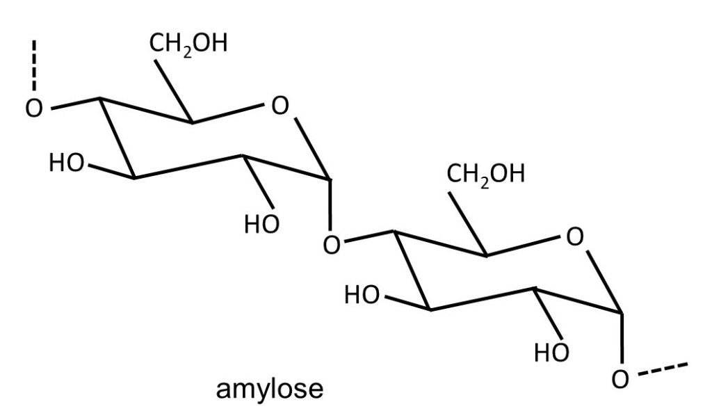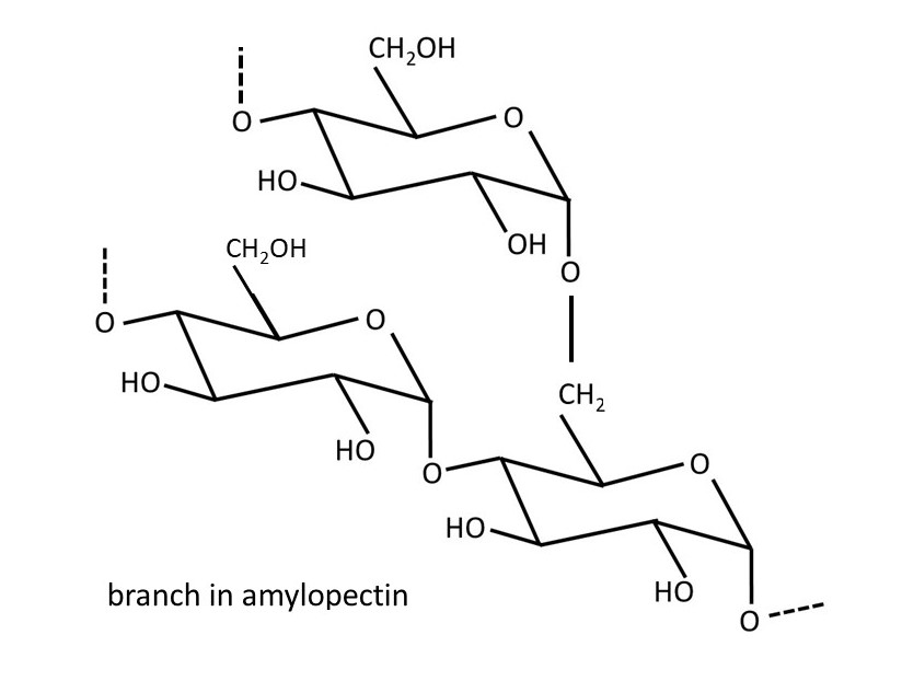Plants make glucose from carbon dioxide and water in a process called photosynthesis; the activation energy for this reaction (post 16.33) is provided by sunlight absorbed by a green pigment called chlorophyll. This glucose is used to make adenosine triphosphate (ATP); hydrolysis of ATP provides the activation energy for the chemical reactions that keep the plant alive (post 16.47). If the plant makes excess glucose, it is stored as starch. Starch is a mixture of the polysaccharides amylose (shown above) and amylopectin. Amylose consists of α-D-glucose residues joined by 1 → 4 linkages. Amylopectin is almost identical but sometimes the polysaccharide chain branches because of the formation of 1 → 6 linkages, as shown below.