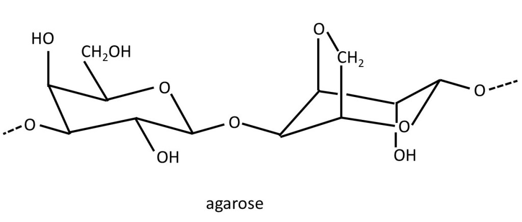 Agar, extracted from seaweeds, is sometimes used to form gels (post 20.39) in cooking and in the food industry. It is a mixture of the polysaccharide agarose and shorter polymer chains called agaropectins. The structure of agarose is shown below. It is a repeating disaccharide (post 20.38) consisting of an α-D-galactose residue (left-hand side) linked 1 → 4 to a 3,6 anhydro-L-galactose residue (left-hand side). These disaccharides are joined by 1 → linkages.