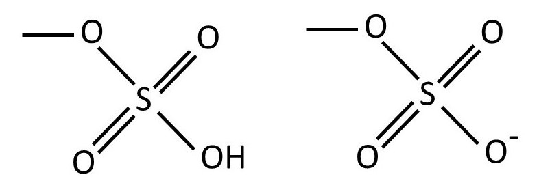 The structure of agarose shown above is a simplification because some -OH groups are replaced by a sulfate group. The structure of the sulfate group is often represented as -OSO3H, as shown on the left-hand side of the picture below. But this group occurs in the strong acid (post 17.49) sulfuric acid, and so it is almost completely ionised to form H+ ions and the -OSO3– ionic group (post 16.40), as shown below.