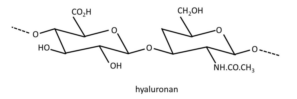 Hyaluronan forms long polymer chains that aggregate shorter polymers in articular cartilage (posts 18.9 and 20.39) to form structures called aggrecans. These large structures prevent polysaccharides from being leached from the cartilage. The side groups on the hyaluronan molecule enable it to form hydrogen bonds (post 16.45) with water and so aid hydrogel formation (post 20.39). For example, it forms a gel in the interior of umbilical cord called Wharton’s jelly. It is used in surgery as a tissue filler. It also occurs in some cosmetic products for use on the face. I know of no evidence that it is absorbed by the skin and so I think it must simply fill wrinkles on the skin surface and not have any biological effect. So, it seems to me, that these products are really not much different to any other facial foundation creams.