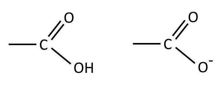 The picture above shows the structure of hyaluronan, sometimes called hyaluronic acid. It is a repeating disaccharide in which β-D-glucuronic acid is joined to β-D-N-acetylglucosamine by a 1 → 3 linkage. The disaccharide residues are then joined by 1 → 4 linkages. The structure of the -CO2H group is shown below (left-hand side). But, because of its similarity to acetic acid, it is a weak acid (post 17.49) and so exists as an equilibrium mixture with the -CO2– group whose structure is also shown below (right-hand side).