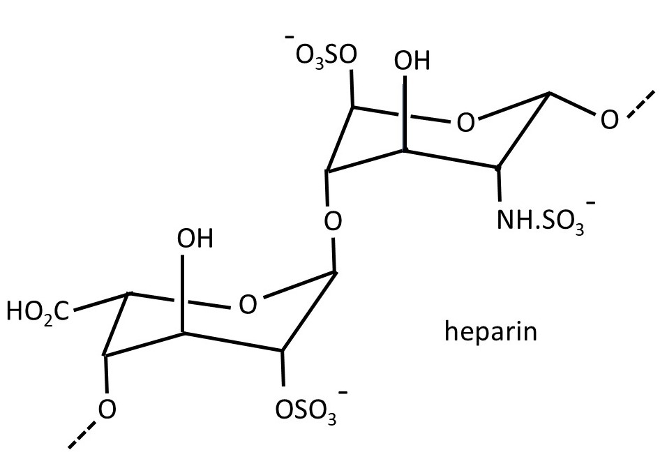 However, this is a simplified version of the structure of heparin because the sulfate groups don’t always appear in the same place. Heparin is an anticoagulant (it inhibits blood clot formation) and is involved in the complicated series of reactions involved in the control of blood clot formation. It is often injected after surgery to prevent unwanted blood clots from forming in veins.