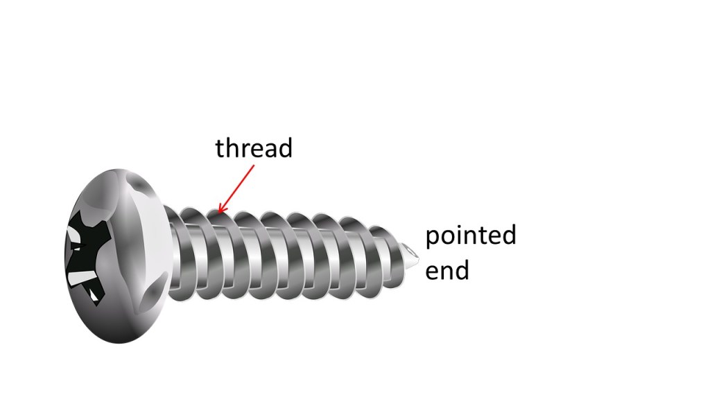 The picture above shows what we call a “spiral staircase”; but it isn’t really a spiral – it’s a helix, because equivalent points at each level of the staircase have the same radius. The thread of the screw in the picture below is a helix, except near the pointed end.