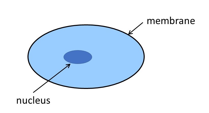 A stained animal cell then shows the features in the picture above – it is surrounded by a membrane and contains a region that takes up more stain, called the nucleus. Books often say that this is a typical animal cell. But different types of cell have their own characteristic appearance so that, for example, an osteoblast (a type of cell in bone) does not look like a nerve cell. However, all cells (apart from red blood cells) have a nucleus.