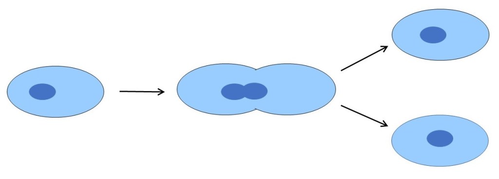 The cells in our bodies can divide, when we are growing, to replace cells, for example, in damaged parts of the body. When a cell divides the nucleus begins to divide and then the whole cell divides into two, as shown in the picture above. During this process, objects called chromosomes appear in the nucleus.