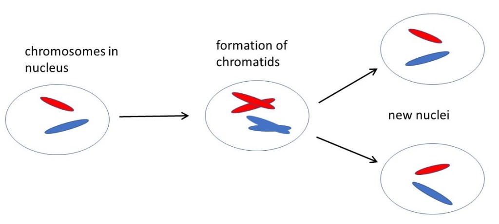 During the process of cell division, each chromosome forms a pair of chromatids. The chromatids then separate to form a complete set of chromosomes for each of the new cells. The process is shown, schematically in the picture above. To keep the picture simple, I’ve drawn only two pairs of chromosomes that I’ve coloured red and blue.