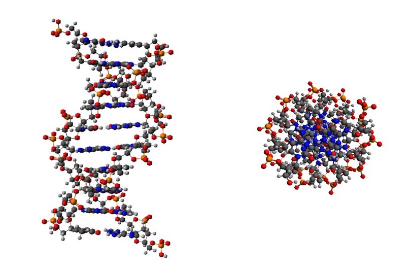 When Crick and Watson started to build models of the sugar phosphate chains, they found it was possible to build right-handed helices, in which non-bonded atoms did not approach more closely than would be possible. And these helices had the pitch and axial rise-per-residue determined by x-ray diffraction. The positions of the atoms, in a length of this double helix are shown in the pictures below. On the left-hand side, we are looking perpendicular to the helix axis. On the right-hand side, we are looking down the helix axis and can see the phosphate groups on the outside and the bases on the inside.