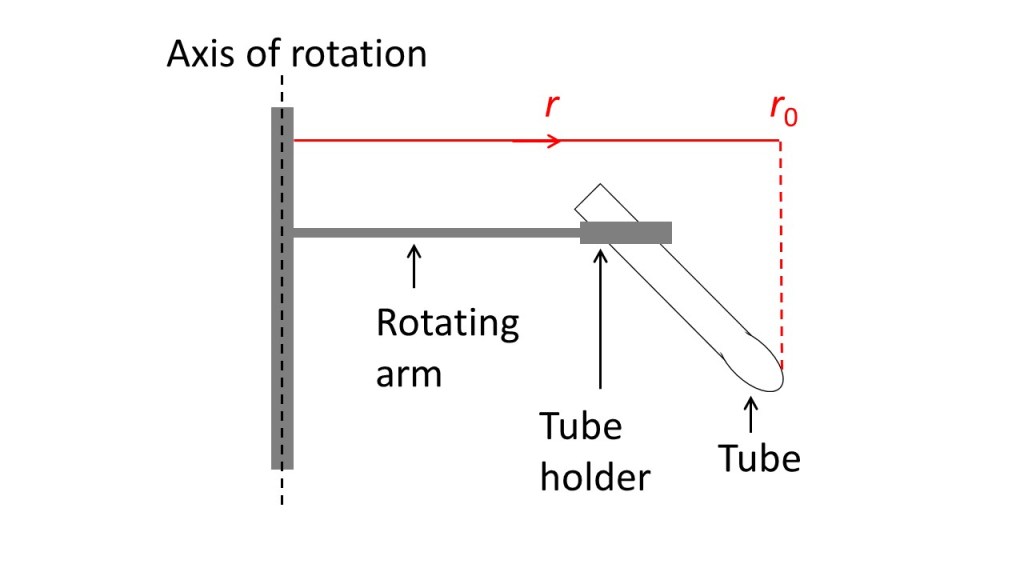 So, the centrifugal force moves particles to the bottom of the tube. This is analogous to the gravity moving an object to the surface of the earth. We can then define a centrifugal potential energy in the same way as we can define a gravitational potential energy. The difference in potential energy at radii r and r0 (where r0 is the radius at the bottom of the tube so that r0 > r) is then given by