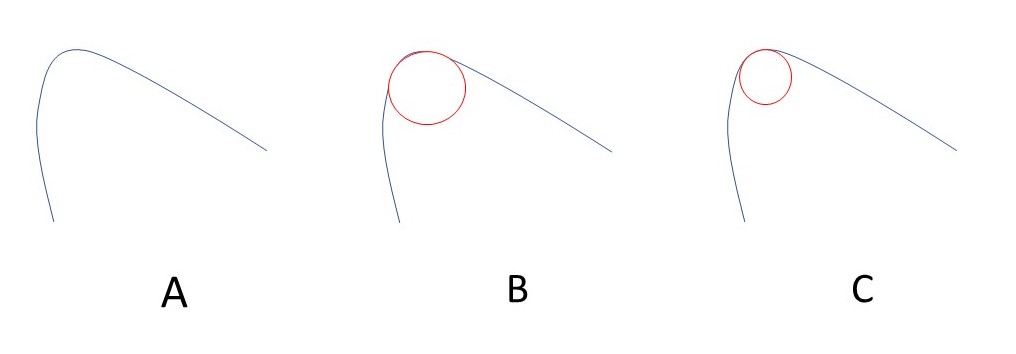 Part A of the picture above shows an asymmetrical curve. But, in part B, we can see that the top part of the curve closely fits an arc of a circle. When we chose a smaller region of the curve and make the circle smaller, in part C, the fit is even better. If we think the fit is sufficiently good for our purpose, we call the radius of the circle the radius of curvature for that part of the curve; the centre of the circle is its centre of curvature.