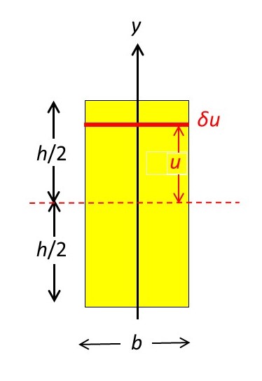 We are going to think about an infinitesimal element of the beam (shown in red in the picture above), a vertical distance u from the dotted red line, that has a height δu. So, this element has an infinitesimal area