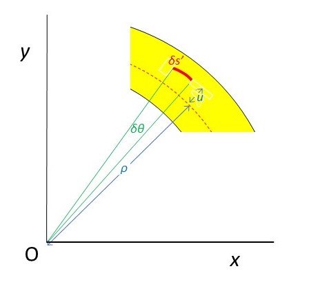 In the picture above, we are looking at a segment of the bent beam. The centre of curvature of this segment defines the origin, O, of a Cartesian coordinate system with the x-axis horizontal. In this plane, the bent red element has a length δs’. The green lines pass, from O to the ends of the red element; the angle between these ends is δθ (measured in radians). We define ρ as the radius of curvature of the neutral axis (dotted red line) of the beam between these green lines. Since we are considering an elemental segment of the bent beam, the curves between the green lines can be considered as arcs of a circle. Then