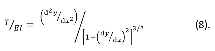 If we can calculate I and the restoring torque in a beam cross-section, and if we know E, we can, in principle, solve equation 8 to find how y depends on x. The result is the curve that describes the shape of a bent beam; this curve is called an elastica. Unfortunately, equation 8 can only be solved for very simple cases. Also, it will have more than one solution and, because it is a differential equation any linear combination of these solutions is also a solution.