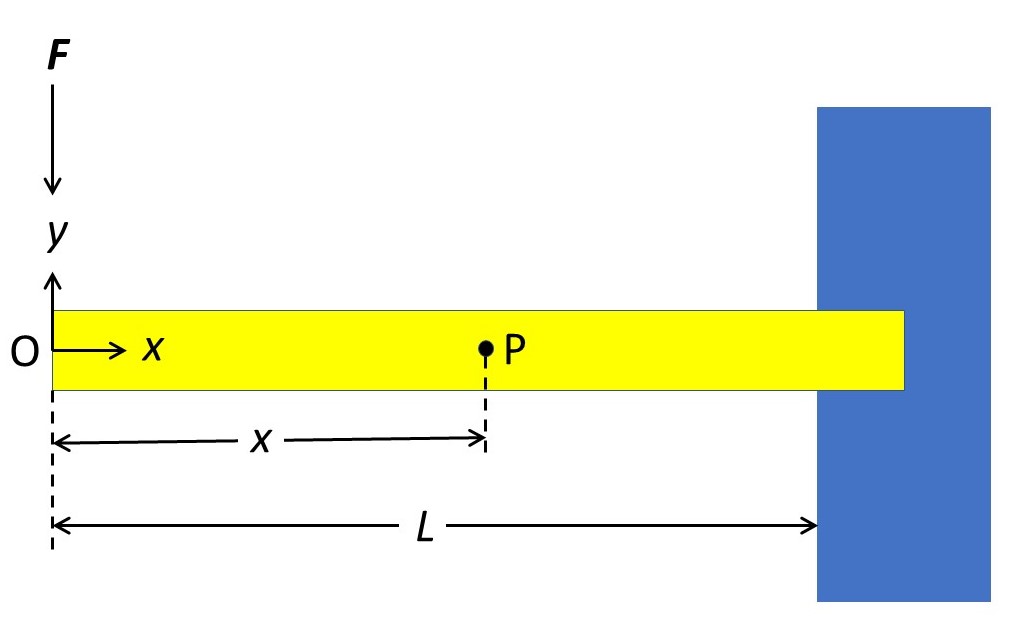 In the picture above, a horizontal cantilever is fixed at the right-hand side. The centre of the cross-section of the free end defines the origin, O, of a Cartesian coordinate system (described above). P is a point at a horizontal distance, x, from O and L is the length of the beam. When a force of modulus F is applied to O, the beam will curve slightly downwards. The torque exerted by this force at P has a modulus Fx; it is positive, by convention, because it acts in an anticlockwise direction. A cross-section of the beam at P is in equilibrium when it exerts an equal and opposite torque of – Fx. Substituting this result into equation 2 gives