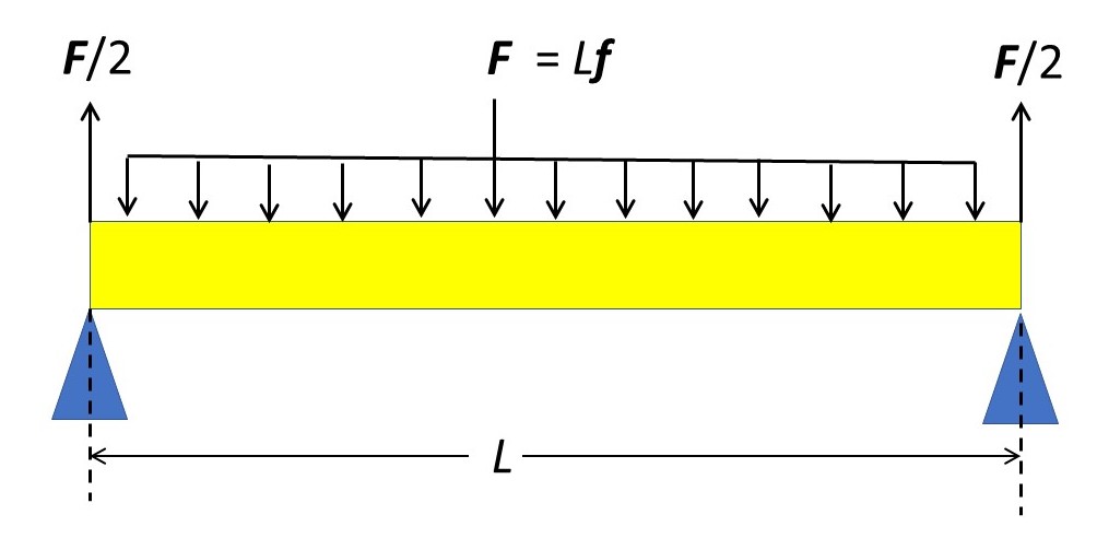 Here, I am thinking about a beam supported at both ends, like the second picture in post 21.17 but now the force F is not applied at the centre but evenly along the length of the beam. The modulus of this force, for a unit length of beam is them f = F/L where L is the length of the beam. For a uniform beam the modulus of reaction force at each support must be identical and equal to F/2. The pattern of loading and, therefore, the geometry of the beam when it bends on the right-hand side must be the mirror image of the left-hand side. The beam is shown in the picture above but I have not tried to represent the curvature of the bent beam because it is very small; this curvature is exaggerated in the third picture of post 21.17.