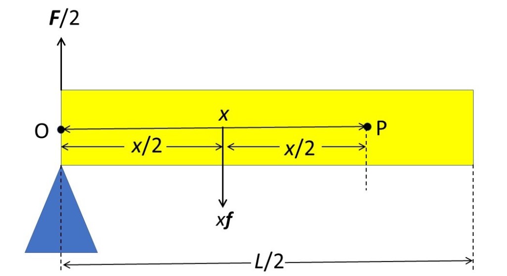 The picture above shows the left-hand side of the beam. I am now going to define the origin, O, of my Cartesian coordinate system at the centre of the cross-section of the beam immediately above the support; the x and y-axes are defined as in example 1. I am going to consider a cross-section of the beam that contains the point P that has coordinates (x, y). The reaction force at the support is equal to F/2 = fL/2; it exerts a clockwise (by convention negative) torque on P of –fLx/2. There is also a force fx that creates a torque on P in the opposite direction. This force acts evenly along the length x of the beam between O and P. It is equivalent to a force fx acting at the centroid of part of the beam between O and P, that is at a distance x/2 from O. The torque exerted by this force is fx2/2. So, the total force exerted on P is fx2/2 – –fLx/2. For the cross-section of the beam that contains P to be in equilibrium, it must exert a torque of