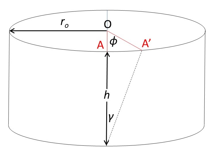 In the picture above, torsion is applied to a cylinder, with a fixed base, so that A moves to A’. O is the centre of the top face of the cylinder and defines the origin of a polar coordinate system where r represents the radial component; the maximum value of r is ro. The angular displacement AOA’ is denoted by ϕ and is called the torsion angle. According to post 20.19, γ is the shear strain for simple shear. If ϕ is measured in radians, the length of the arc AA’ is roϕ.