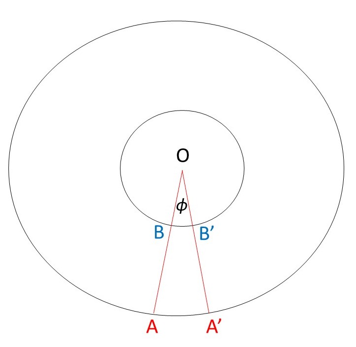 You can see, from the picture above (looking down on the top of the cylinder), that ϕ is constant for all values of r but γ increases from zero, at r = 0 (because torsion does not affect the position of O), to its maximum value, γmax, at r = ro. For example, you can see that the length of the arc BB’ is much less than AA’ so the value of γ at this radius is less than γmax. So, we can rewrite equation 1 as