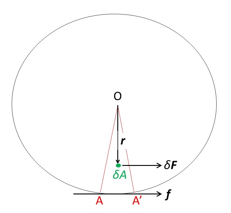 The force that applies torsion to a cylinder must act in the direction of a tangent to its circular upper surface (that is in the direction of f in the picture above) to move A to A’; this direction is perpendicular to the radius of the circle (appendix 2). Now let’s consider an elemental area δA, in the plane of this surface, and an elemental force δF applied to it, in this plane, in the direction of f. From the definition of shear stress
