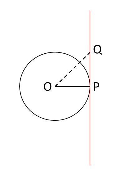 In the picture above, OP is the radius of a circle. The red line is a tangent to the circle. Any point Q on this line, other than P, must have OQ longer than OP since the tangent touches the circle only at P and Q is outside the circle. So, OP is the shortest distance between O and P. Since the shortest distance between a point and a line must be the perpendicular distance from the point to the line, OP is perpendicular to the tangent.