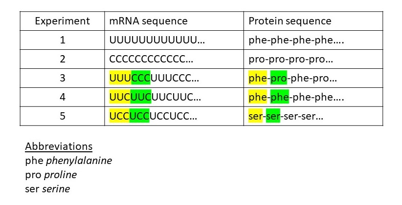 Let’s look at some examples of these experiments (see table above). In experiment 1, we see that mRNA in which all the bases are U codes for poly(phenylalanine). In experiment 2, when all the bases are C, the mRNA codes for poly(proline). Experiment 3 suggests that the code is a non-overlapping three-letter code. Further evidence for this conclusion is provide by experiments 4 and 5 which show that if the code were overlapping, the protein sequence in experiment 3 would be: phe-phe-ser-pro…