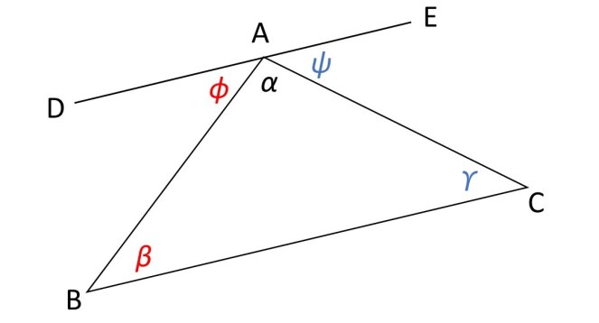 Since DE is parallel to BC ϕ = α. This is because if they were unequal DE would slope towards BC and they would no longer be parallel. Similarly ψ = β.
