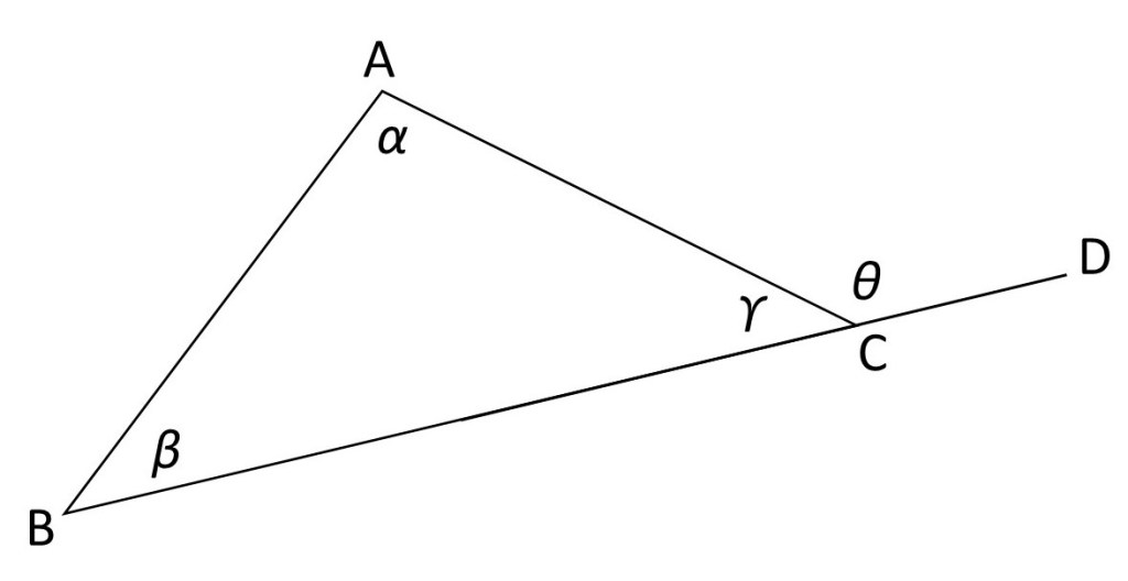 Now let’s extend the side BC to D and call the angle AĈD θ (the little pointed hat on the letter C is to show that AĈD represents an angle); θ is called the external angle of the triangle at C.