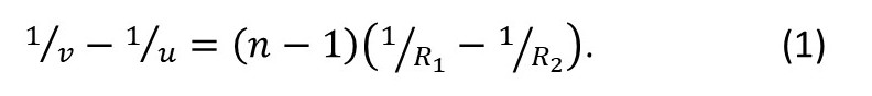 In equation 1, R1 is the radius of curvature of the left-hand surface of the lens and R2 is the radius of curvature of the right-hand surface; n is the refractive index of glass. This result means that for our lens 1/v – 1/u depends only on its geometry and the refractive index of its glass. This inverse distance is independent of the angle θ. We can then define