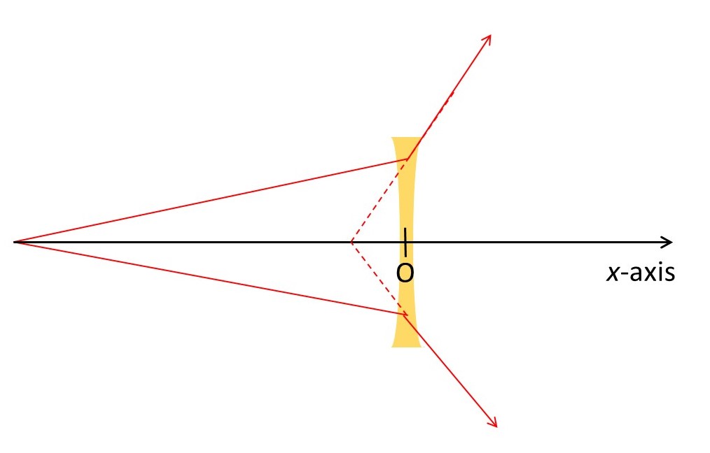 You may see equations 2 and 3 written with different signs. This is because there are different sign conventions used to calculate what happens when light passes through a lens. The convention that I am using is explained in more detail in appendix 4 and is called the Cartesian sign convention. Let’s think about a bi-convex lens. The distance from the origin to the centre of curvature of the first surface is in the positive x-axis direction, so R1 has a positive value. The distance from the origin to the centre of curvature of the second surface is in the negative x-axis direction, so R2 has a negative value. As a result, f is positive for a bi-convex. The same sort of reasoning leads to the conclusion that f is negative for a bi-concave lens. What does a negative value of f mean? It means that, if we extend the refracted rays backwards, they appear to cross the x-axis (the principal axis) in the negative direction, as shown below.
