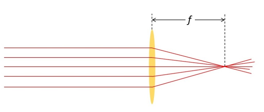 Now let’s suppose that A is so far from the lens that R1 is close to infinity. Then, from equation 2, v = f since 1/∞ = 0. For all values of θ, the light rays will be effectively parallel when they reach the lens. So, the lens focusses parallel rays of light to a point that is a distance f from the lens, as shown in the picture above; this point is called the focal point of the lens We can use this result to start a fire with our lens by focussing radiation from the sun on to a piece of paper.