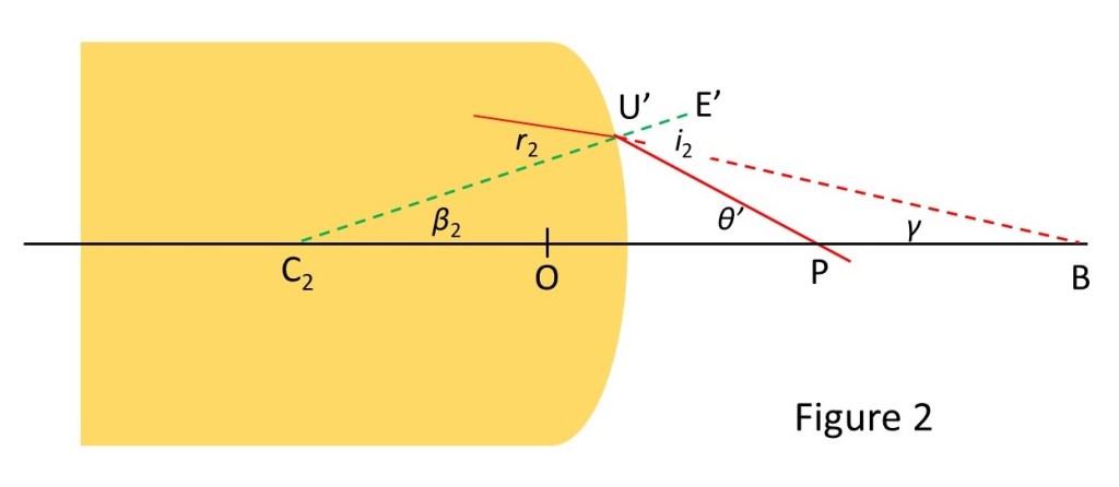 Figure 2 is like the right-hand side of the first picture in the main text, except that that ray emerges from a continuous block of glass. U’ is the point at which the ray leaves the curved surface. C2 is at its centre of curvature. So C2U’ is perpendicular to a tangent of the curve at U’ (and so is perpendicular to the curved surface at this point); the distance from C2 to U’ is the radius of curvature. B is the same point as in Figure 1. U’E is the extension of C2U’. The angles θ’ and β2 are two internal angles of the triangle PU’C2 as marked; γ is the same as in Figure 1.