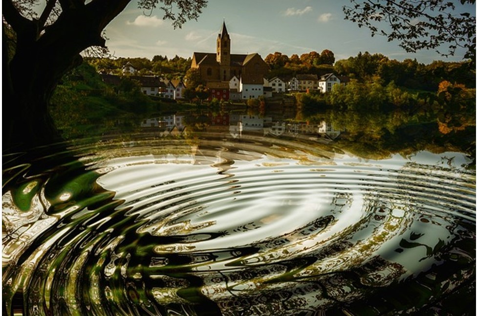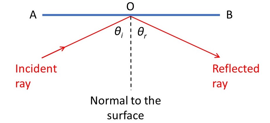 We usually explain reflection, for example the image we see in a mirror, by ray-tracing. In the picture above, the line AB, is where a plane mirror, perpendicular to the plane of the picture, meets the plane of the picture. The incident ray meets AB at O. The line that meets the mirror at O and is perpendicular to it is called the normal to the surface of the mirror. We can explain what we see in the mirror using two simple scientific laws – the laws of reflection. Here is the first:
