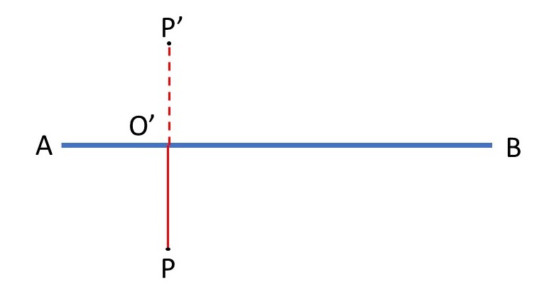 where O’ is the point where PP’ intersects AB. Appendix 2 shows how these results can be derived from the laws of reflection. These results mean that, when a point is reflected in a mirror, there is a point in the image that is directly in front of it (behind the mirror) and that the original point and the reflected point are the same distance from the reflecting surface.