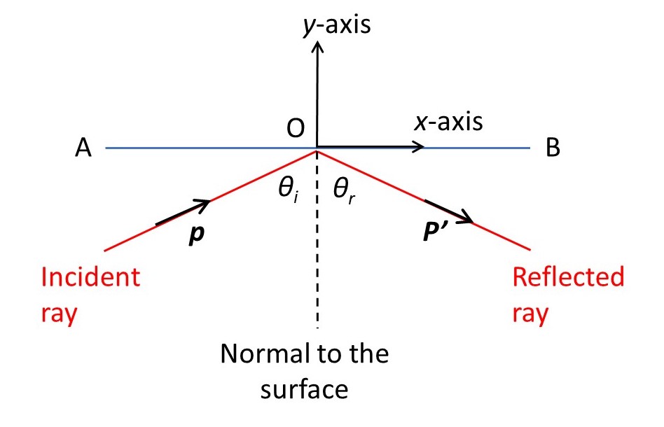 The purpose of this appendix is to derive the laws of reflection. In the picture above, the incident ray meets the mirror, AB, at O, the origin of a Cartesian coordinate system. The x-axis lies on the surface of the mirror, in the same plane as the incident ray and the normal to the surface at O; the y-axis forms a right-handed coordinate system.