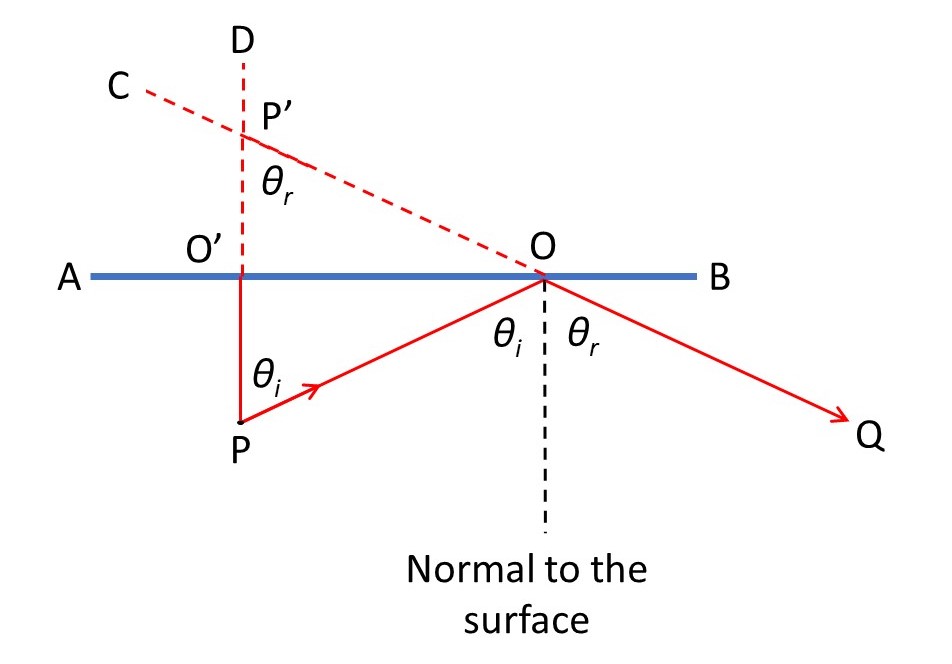 Since θr = θi (laws of reflection), O’P’/O’O = O’P/O’O or O’P’ = O’P.
