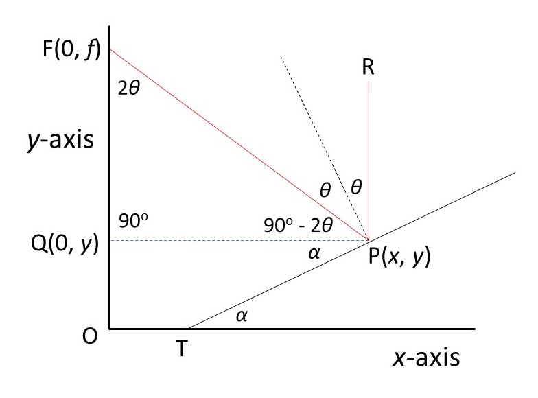 In the picture above, P is a point on a concave mirror that reflects the ray RP along the path PF, where F is defined in the main text. TP is the tangent to the curve at P and the dotted black line is perpendicular to TP. The blue dotted line PQ is parallel to the x-axis.