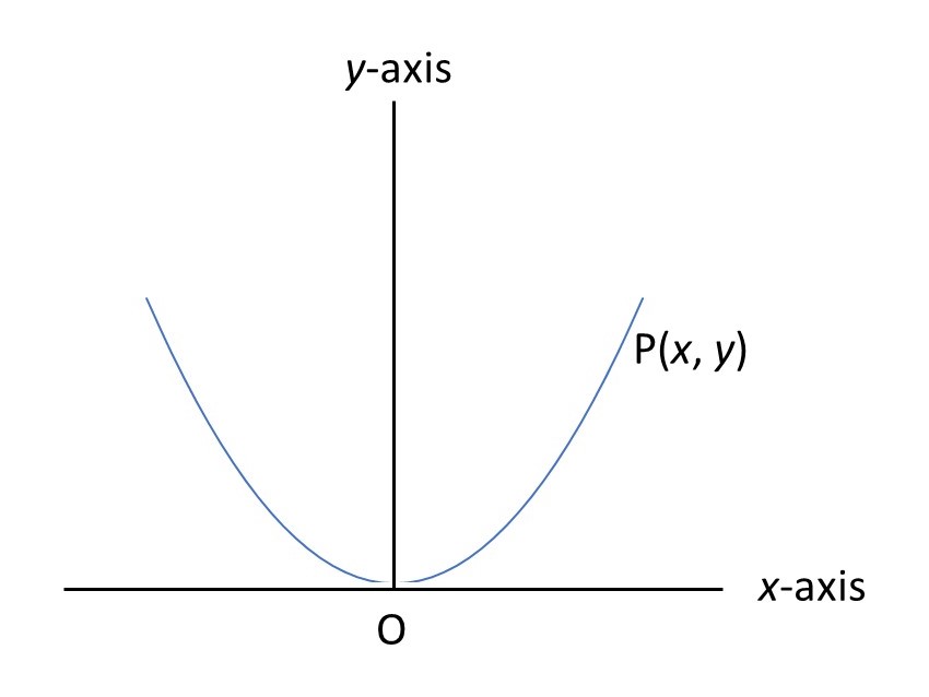 In the picture above, the axis of the symmetrical curve (coloured blue) defines the y-axis of a Cartesian coordinate system whose origin is at the minimum of the curve. The x-axis makes a right-handed set. P is a point on the curve with coordinates (x, y); the type of curve defines how y depends on x. The three-dimensional concave surface is formed by rotation about the y-axis to form a dish-shaped object.