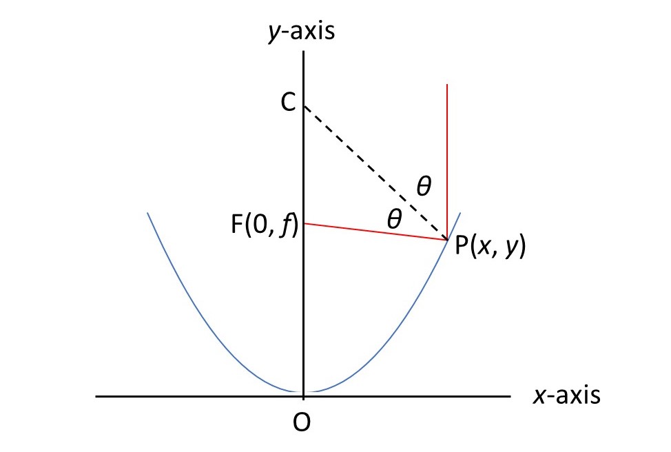 In the picture above, the axis of the dish points in the direction of the source. A ray parallel to this direction that meets the dish at P is reflected and meets the axis at F; the coordinates of F are defined to be (0, f), since it lies on the y-axis. The dotted black line is perpendicular to the tangent to the curve at P. Then, since the angle of incidence is equal to the angle of reflection, PC makes equal angles of θ with the incident and reflected rays. (You may have noticed that C is the centre of curvature of the curve at P so CP is the radius of curvature – if you haven’t, it doesn’t matter). In appendix 1, I show, for any curve that is symmetric about the y-axis, that
