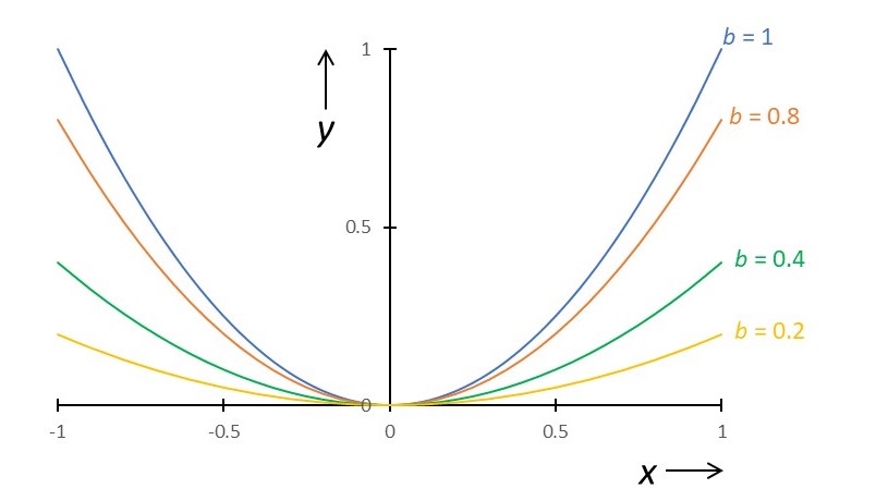 as shown in the picture above; this picture shows how the value of b influences the appearance of a parabola. When this curve is rotated about the y-axis, it generates a three-dimensional shape called a paraboloid. Then