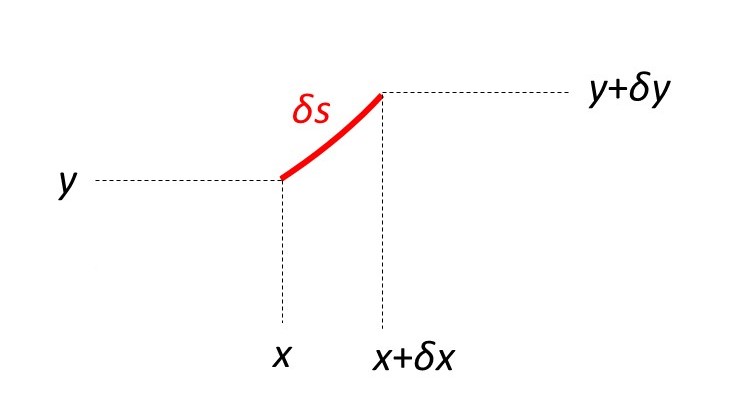 The picture above shows an infinitessimal length, δs, of curve between the points (x, y) and (x + δx, y + δy). Since δs is infinitesimal, it is almost a straight line. Applying Pythagoras’ theorem gives