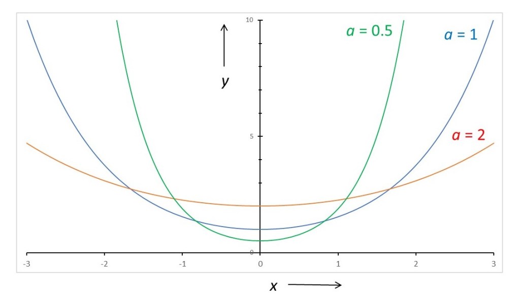 You can see that the shape of the curves looks a lot like the shape of a parabola (see post 22.6). But it’s not the same because the value of y is never zero, for non-zero values of a. This should warn us that, just because an object appears to have a geometric shape that we know about, the appearance can be deceptive!