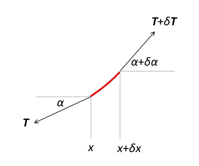 In the picture above, the red line is an infinitesimal length, δs, of a catenary between x and x + δx. At the lower point (x-coordinate x), the tension in the cable is the vector T. Since, at the higher point (x-coordinate x + δx), the cable supports the weight of the cable below, the tension is greater than at the lower point and is represented by T + δT. I define the angle that the red element makes with the horizontal (x-axis direction) as α (at x) and α + δα (at x + δx).