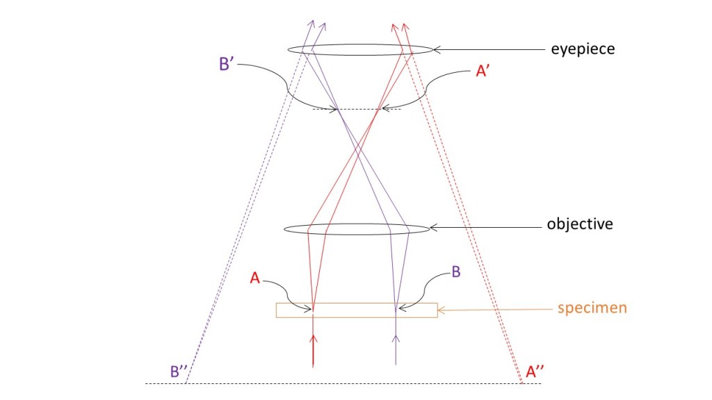 The picture above uses ray tracing to show that the image is magnified at each stage. I have showed the path of the rays that pass through A, in the image, in red and the path of rays that pass through B in purple. The objective forms a magnified, real inverted image, A’B’, that is further magnified by the eyepiece to produce a virtual image, A’’B’’, like the magnifying glass in post 22.3. The overall magnification of the microscope is the magnification of the two lenses multiplied together; more details are given in the appendix. In this picture the condenser, objective and eyepiece have the same principal axis – called the optical axis of the microscope. But, in the microscope shown in the first picture, the optical axis is bent by a prism – to make it easier to look into the eyepiece.
