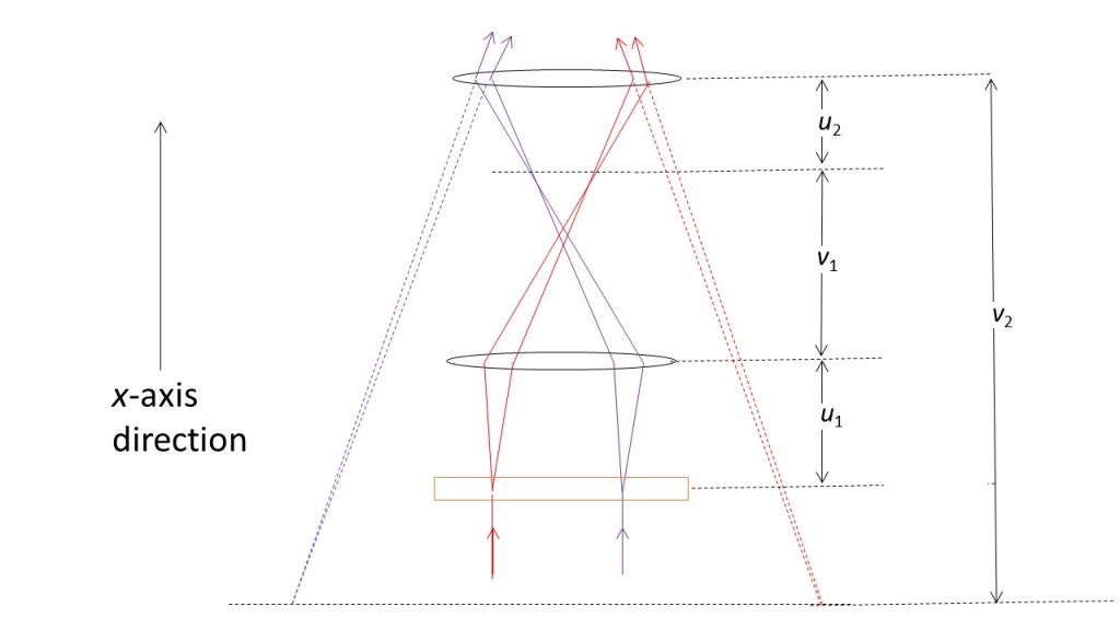 If we replace the eyepiece with a camera lens to project a real image on to a detector at a distance v2 from the lens (in the positive x-axis direction)