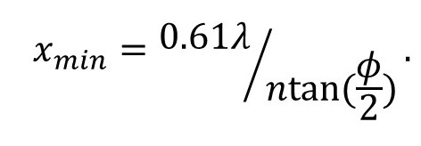 We call the value of xmin the resolution of the microscope. Sometimes you will see this equation modified to allow for a medium of refractive index n between the object and the objective. Then equation 6 is modified to give
