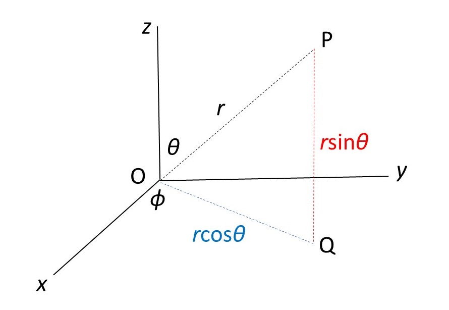 The spherical polar coordinates of P are then r, θ and φ; its Cartesian coordinates are x, y and z.