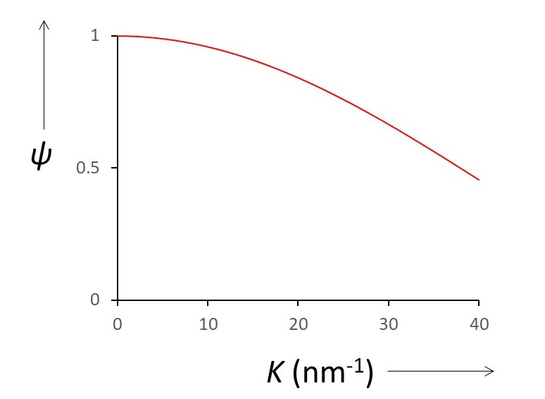 The single electron in the hydrogen atom is in the 1s atomic orbital that has spherical symmetry. To calculate the atomic scattering factor, I should really use the wave function of this atomic orbital to find the probability of finding the electron at a given value of r (see post 19.28) and make the limits of integration between 0 and the value of r at which the probability of finding the electron is negligibly small. This is not easy. And all I want to do is indicate how the atomic scattering factor depends on K. I can do this by assuming that the electron is at the most probable value of r (called the Bohr radius). The is not really valid but does give an indication of the shape of the graph shown at the end of the main post. The Bohr radius for hydrogen is about 0.05 nm, allowing the approximate atomic scattering factor to be plotted against K.