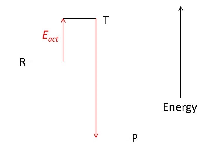 To rearrange the atoms in reactant molecules to make product molecules, we first need to break chemical bonds in the reactant molecules. This requires energy, called the activation energy, Eact, usually in the form of heat. The high energy system created before the products can form is called the transition state, T. But it may be difficult to supply enough energy to form the transition state. For example, it may be difficult to increase the temperature high enough to supply enough heat.
